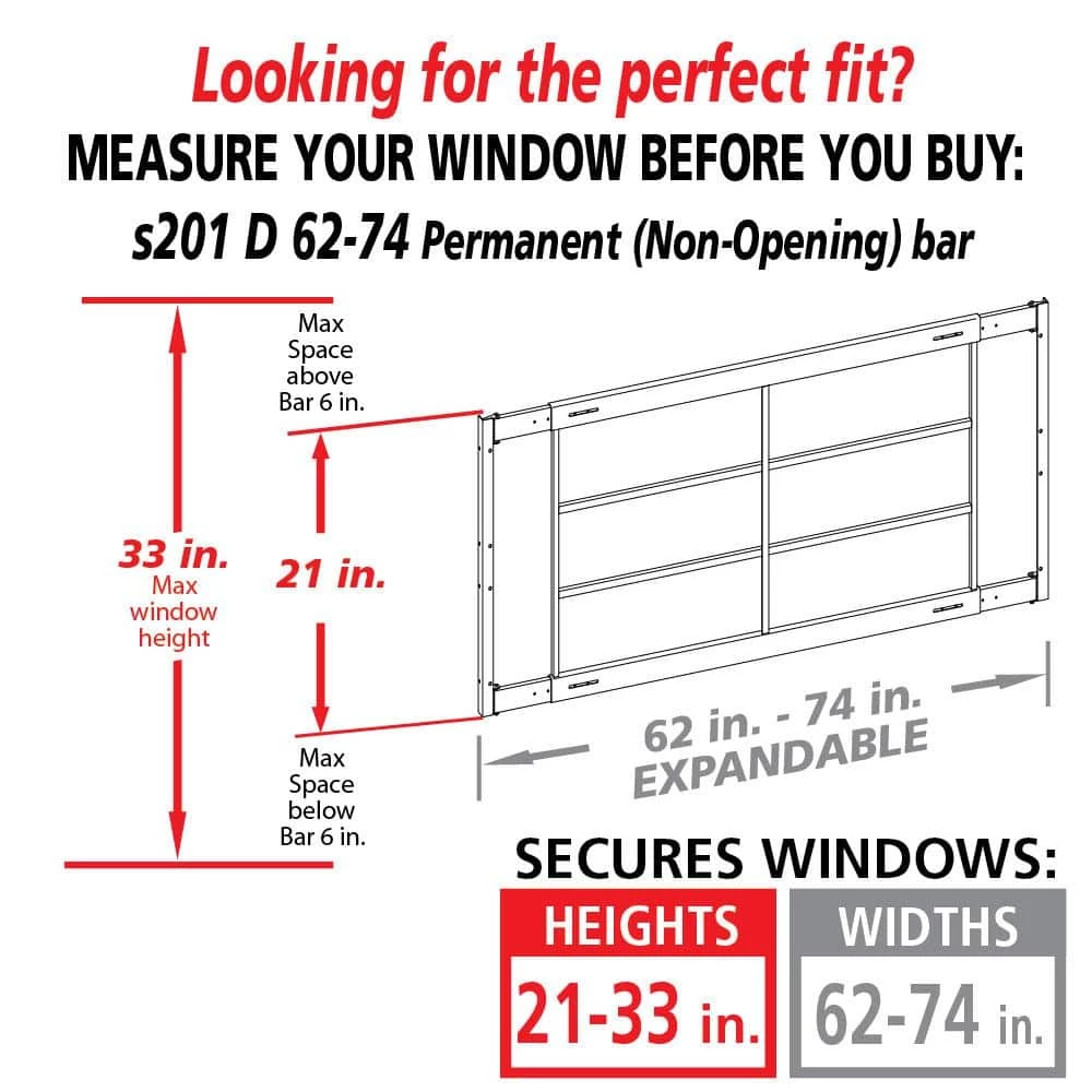 - Fits window heights from 21 in. to 33 in. with a maximum of 6 in. space above and below the security bar
