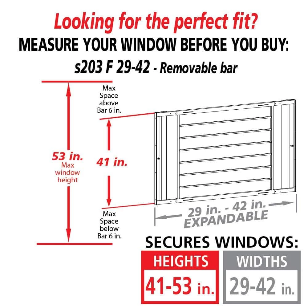 - Fits window heights from 41 in. to 53 in. with a maximum of 6 in. space above and below the security bar
