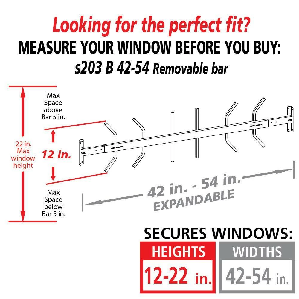 - Fits window heights from 12 in. to 22 in. with a maximum of 5 in. space above and below the security bar