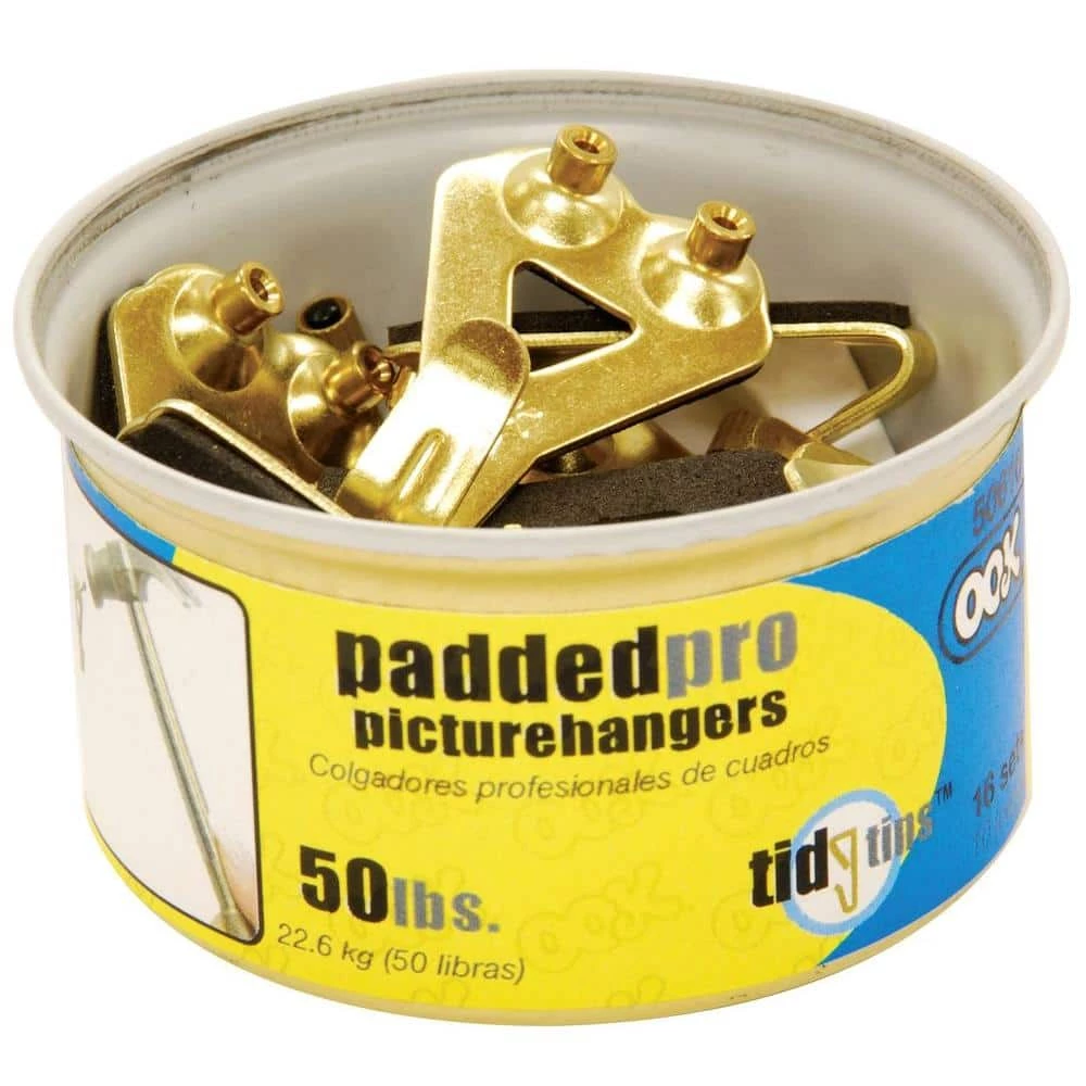 OOK Padded Professional Picture Hangers use one or two channels for the nails, depending on how much weight the picture hanger is to hold. The hook’s center-of-gravity guides are hand welded and allow no play in the nails, so the nail glides straight into the wall at the perfect angle for a secure hold. The padded backing protects the walls surface. Hanger is ideal for plaster and drywall surfaces. Picture Hooks packaged in a reusable storage tin, ideal as tool box stuffers or to keep in your kitchen drawer.