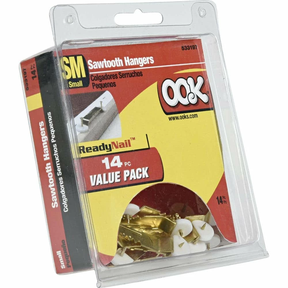 Hands-free OOK ReadyNail Sawtooth Hangers have pre-inserted nails. All you have to do is place on the frame and hammer into the desired location. This hanger is great for use with wooden frames. Available in large and small sawtooth hangers to fit your desired frame size. Tip: please ensure that you are using the appropriate sized wall hanger (cleat, hook, nail, etc.) to bear your frame’s weight when using Hillman Sawtooth Pro Hangers.
