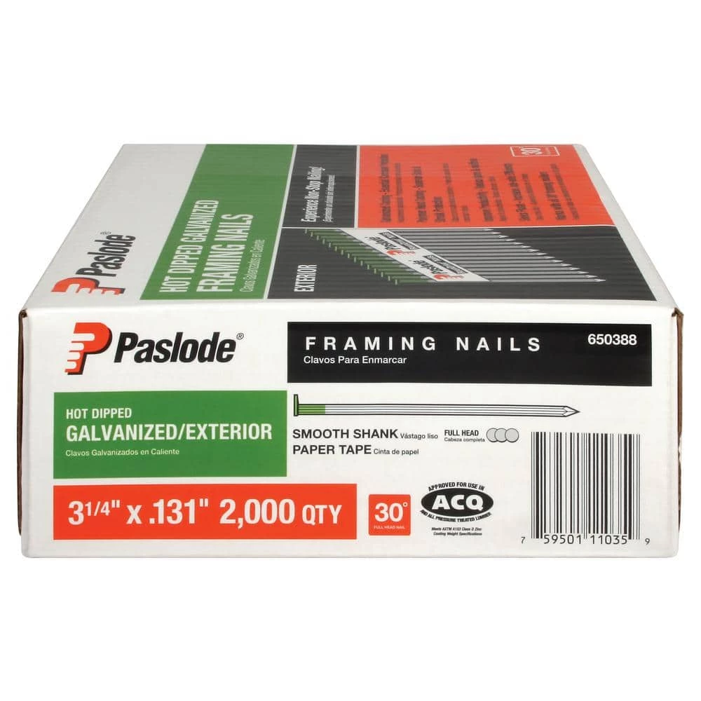 Paslode Hot Dipped Galvanized 3-1/4 in. x 0.131-Gauge 30° Framing Nails are designed and manufactured to match the specs of Paslode framing nailers so your nailer will run smooth, with fewer jams and misfires. Nails drive flush even into the harder woods and LVL’s. Plus, Paslode adds a polymer coating around the shanks and heads to reduce staining, streaking and nail discoloration. To experience non-stop nailing, use Paslode Hot Dipped Galvanized framing nails for exterior framing jobs.