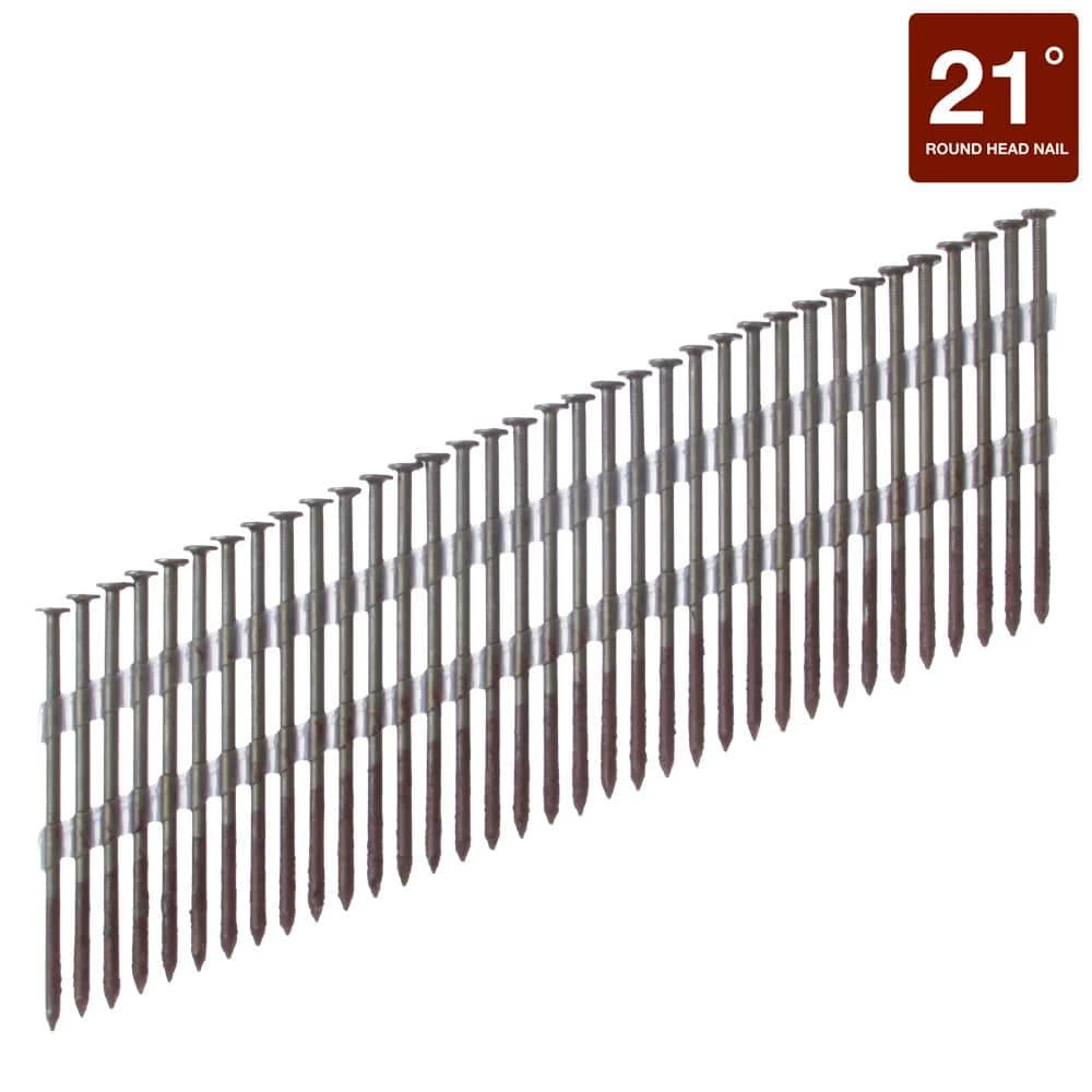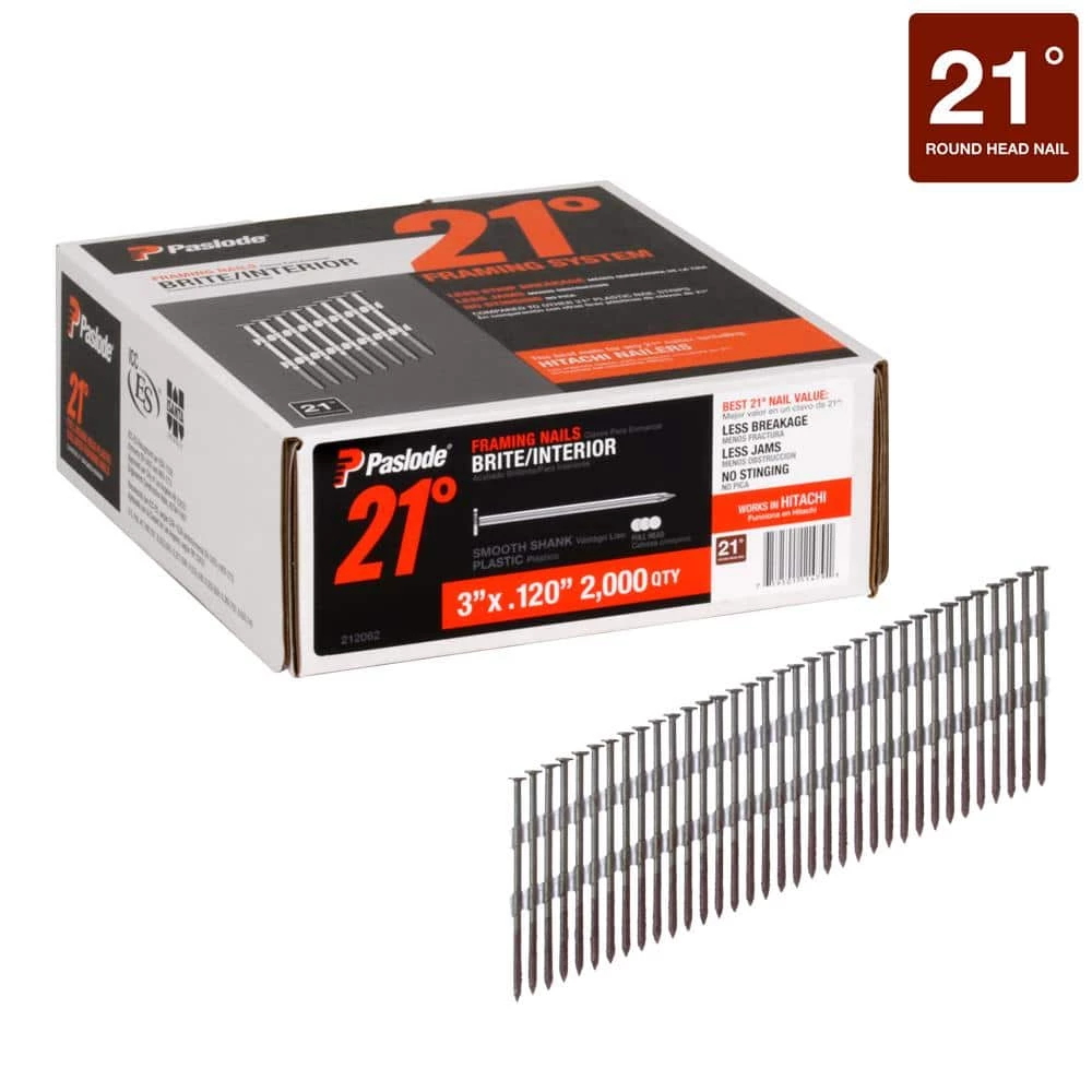 Paslode 3 in. x 0.120-Gauge 21° Brite Smooth Shank Plastic Collated Framing Nails provide less breakage, fewer jams and misfires and no stinging. A durable resin collation allows the nails the flexibility to not break when dropped. Paslode 21° nails have a shear-point collation that helps reduce jams and misfires. Finally, there is no stinging or flying debris hitting you in the face while you work.