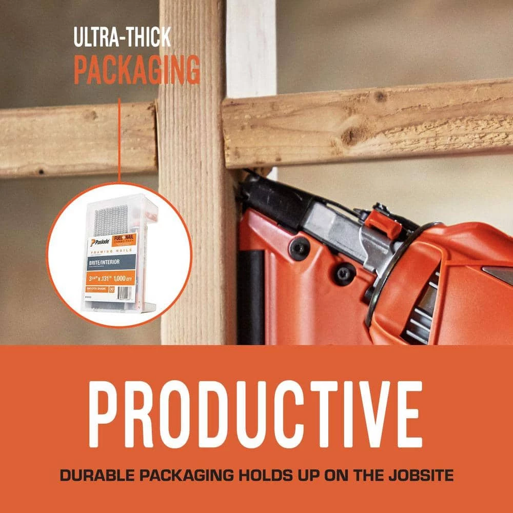 This Paslode FUEL+NAIL Combo Pack includes 1,000 3 in. x 0.120-Gauge Brite Smooth Shank Framing Nails and one Framing Fuel Cell that are matched to work like a fuel gauge – when you drive all the nails, it’s time for more fuel. Perfect size helps keep interior remodeling jobs on budget.