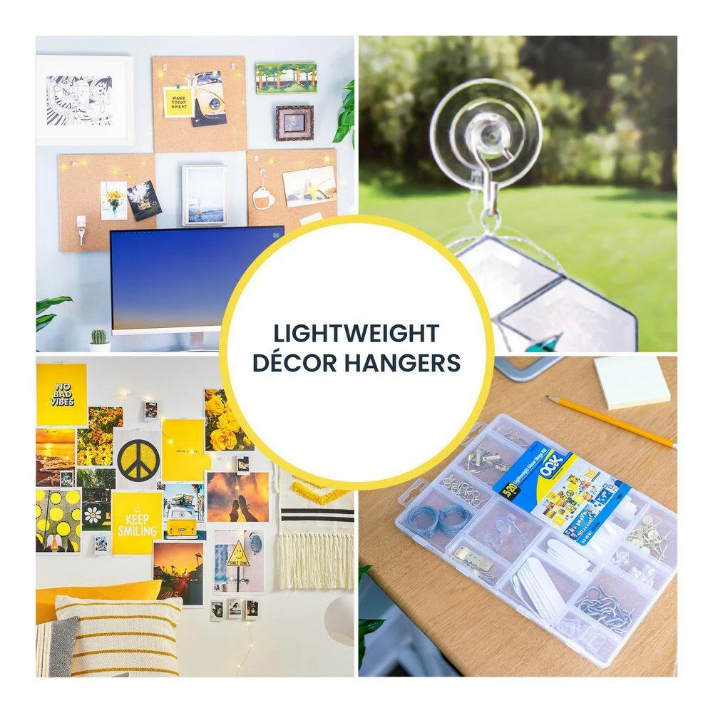 - (2) 10ft wire, (20) small screw eyes, (15) 10lb picture hangers, (5) 20lb picture hangers, (5) small sawtooth hangers, (4) small suction cups, (15) colored push pins, (20) clear push pins, (6) medium poster strips, (12) small poster strips, (4) adhesive hooks, (5) picture clips, (15) 7/8″ nickel cup hooks, (5) decor pins, (15) one step hangers