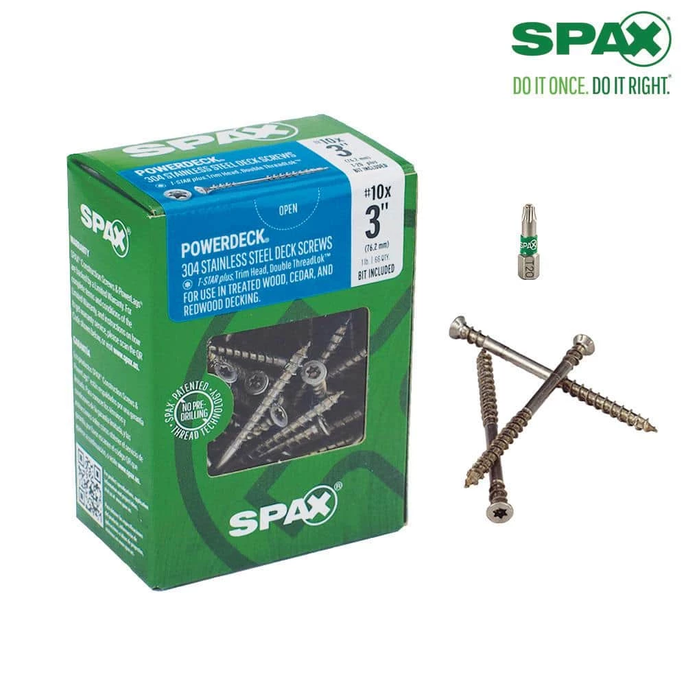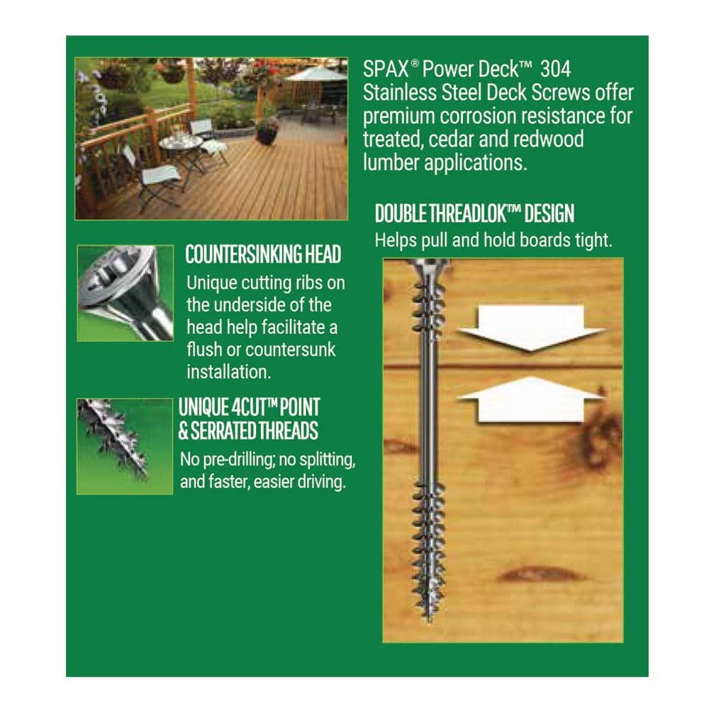 The SPAX Factor – For the craftsman that concentrates on the details, We Work for You. For the Pro that puts qualify first, we help you create stronger connections, enhance performance and improve results when your reputation is on the line. Stainless Steel screws offer the ultimate corrosion resistance and aesthetics in wood decking and railing applications. Made of 300 series stainless steel, these screws are ideal for exterior applications in most environments. SPAX is your trusted partner for your fastening needs. Do it Once, Do it Right with SPAX.